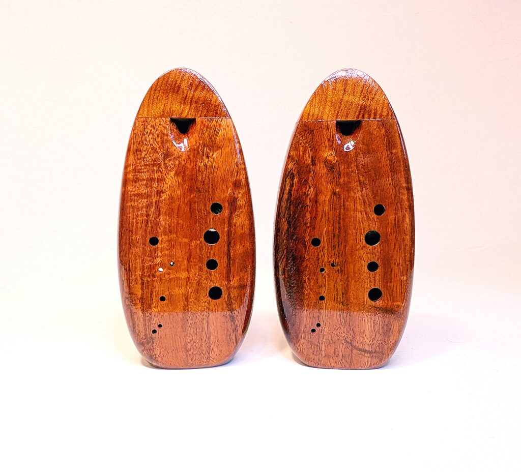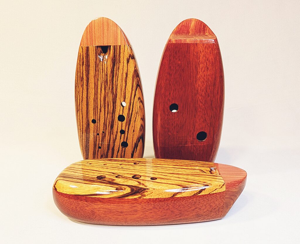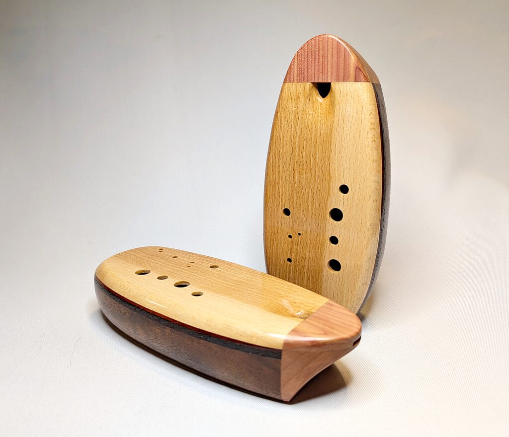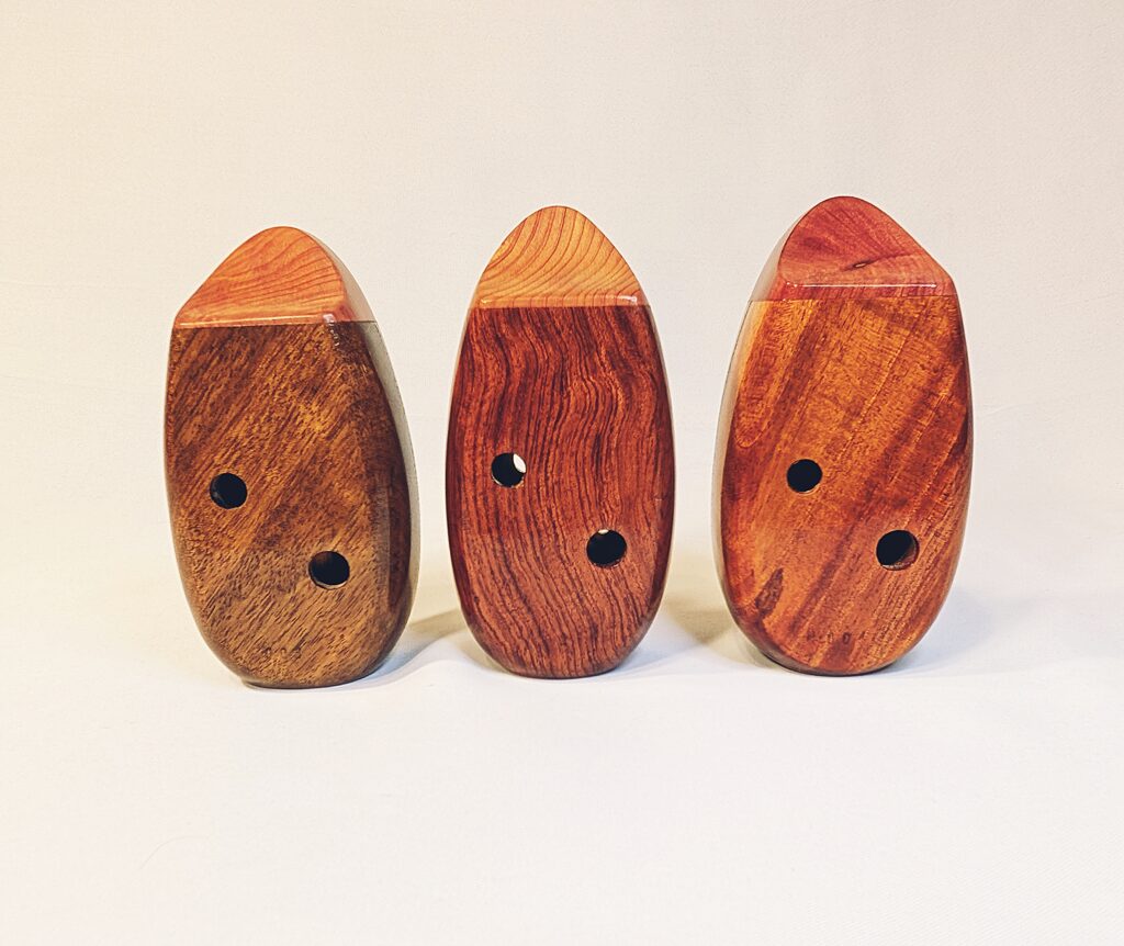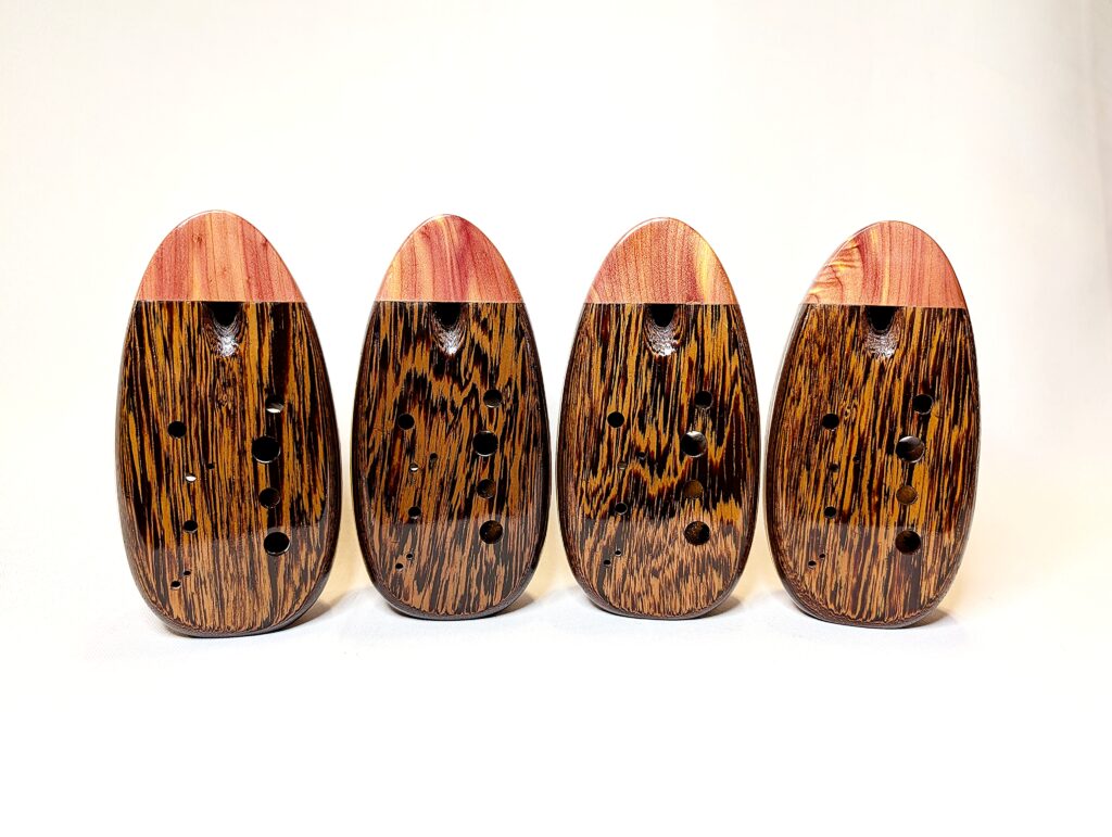 The wooden inline ocarina has become a cornerstone at Bretti Musical Instruments, redefining it as a high-end woodwind. Each ocarina is painstakingly crafted over a 3 month period, with exceptional attention to material selection, wood pairing, grain features, layout, voicing, and finish. The inline ocarina has historically been seen as a more limited instrument compared to its far more ubiquitous transverse (or “sweet potato”) ocarina cousin, and compared to transverse ocarinas, who have enjoyed significant advances over the years, the inline family of ocarinas has remained relatively stagnant. Up until this point, inline ocarinas have featured a more limited note range, with limited available materials, with makers of inline ocarinas have become increasingly rare. My goal with the inline ocarina however has been to elevate the inline to a high-end, professional quality woodwind for the discerning musician and collector, and offer an unmatched selection of extraordinary woods and a wider number of keys than prior available.