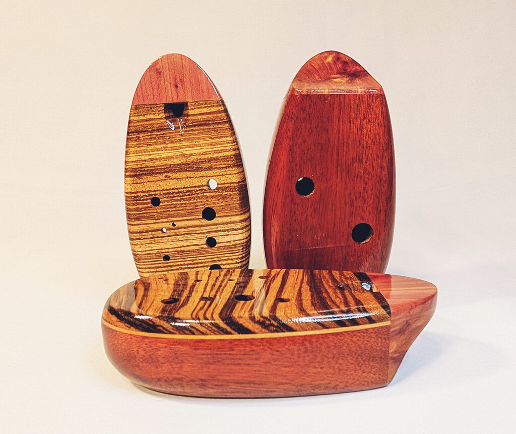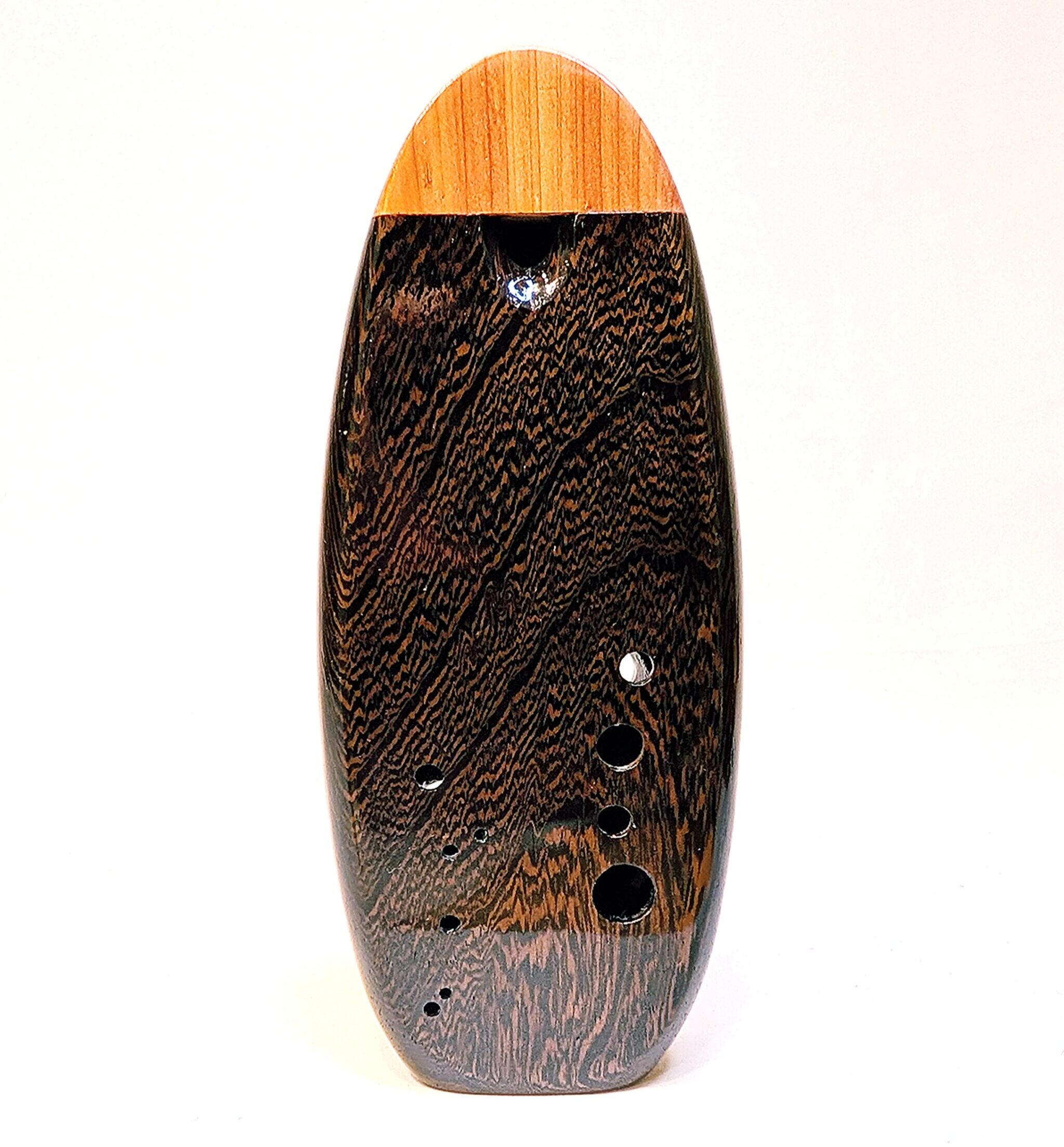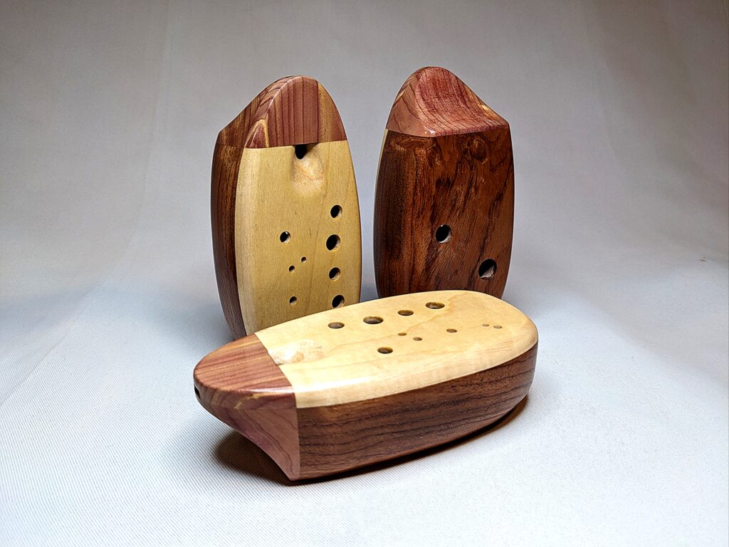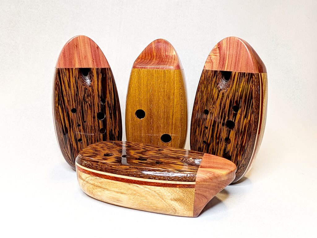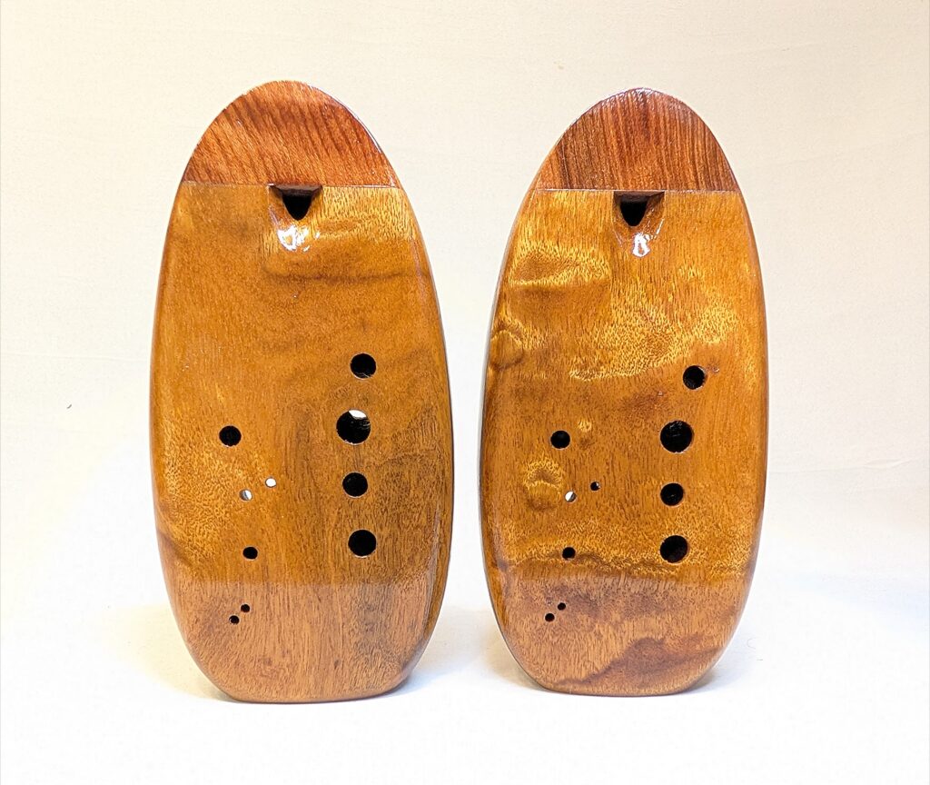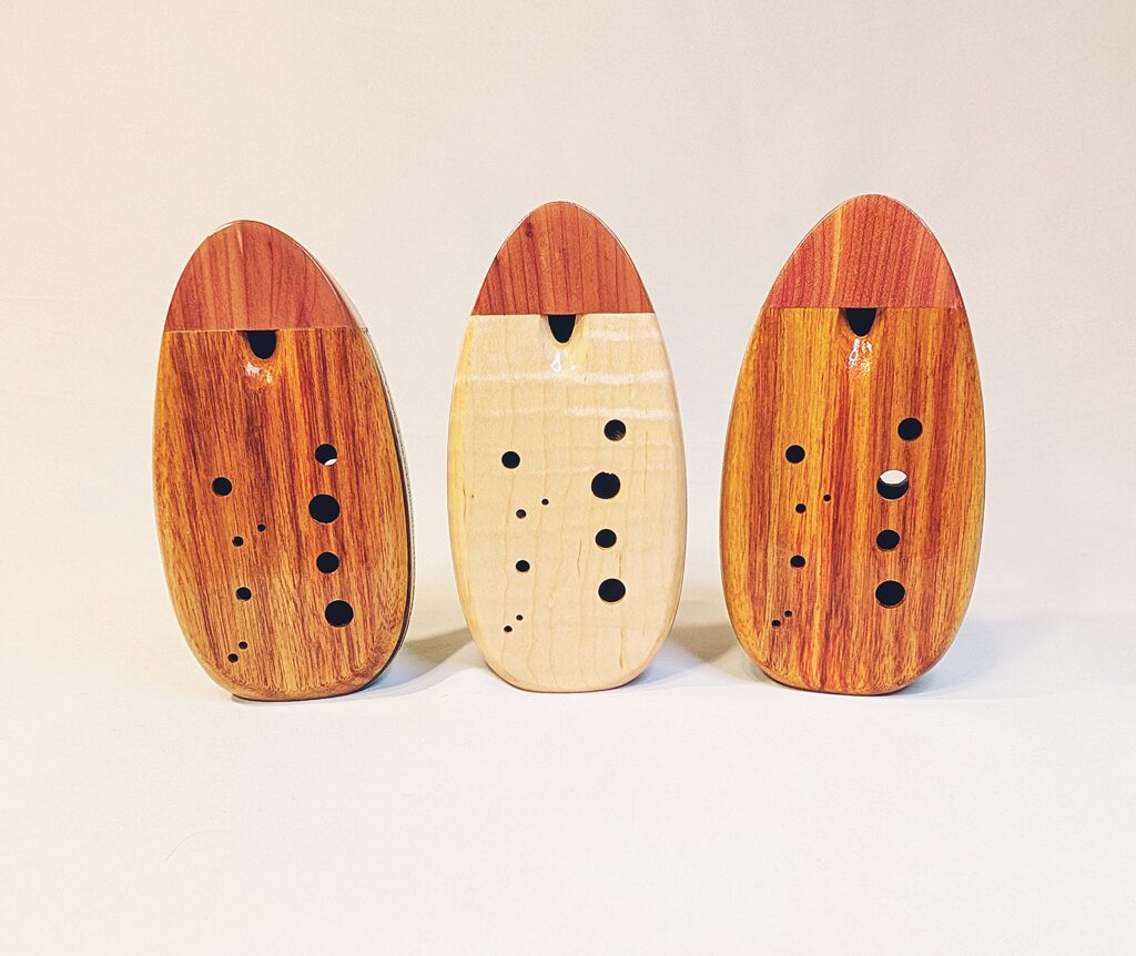 The wooden inline ocarina has become a cornerstone at Bretti Musical Instruments, redefining it as a high-end woodwind. Each ocarina is painstakingly crafted over a 3 month period, with exceptional attention to material selection, wood pairing, grain features, layout, voicing, and finish. The inline ocarina has historically been seen as a more limited instrument compared to its far more ubiquitous transverse (or “sweet potato”) ocarina cousin, and compared to transverse ocarinas, who have enjoyed significant advances over the years, the inline family of ocarinas has remained relatively stagnant. Up until this point, inline ocarinas have featured a more limited note range, with limited available materials, with makers of inline ocarinas have become increasingly rare. My goal with the inline ocarina however has been to elevate the inline to a high-end, professional quality woodwind for the discerning musician and collector, and offer an unmatched selection of extraordinary woods and a wider number of keys than prior available.