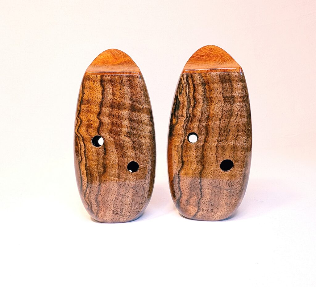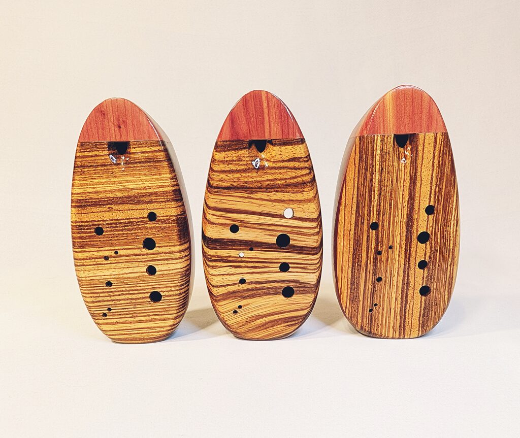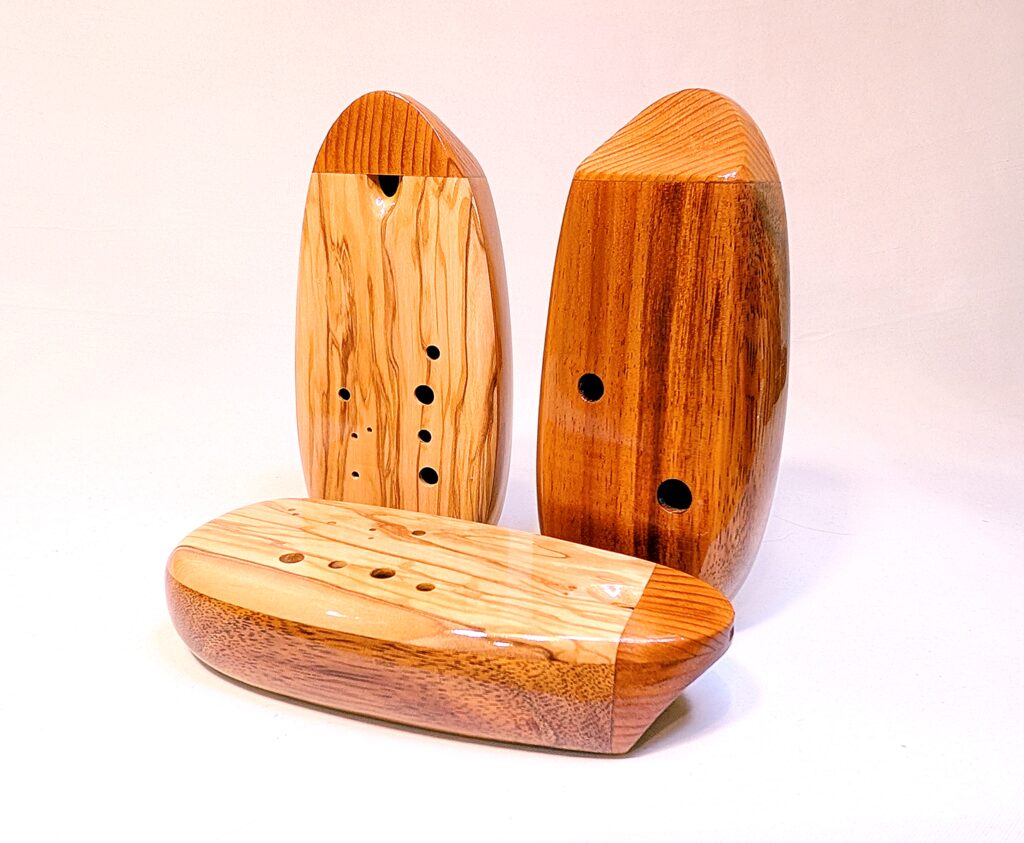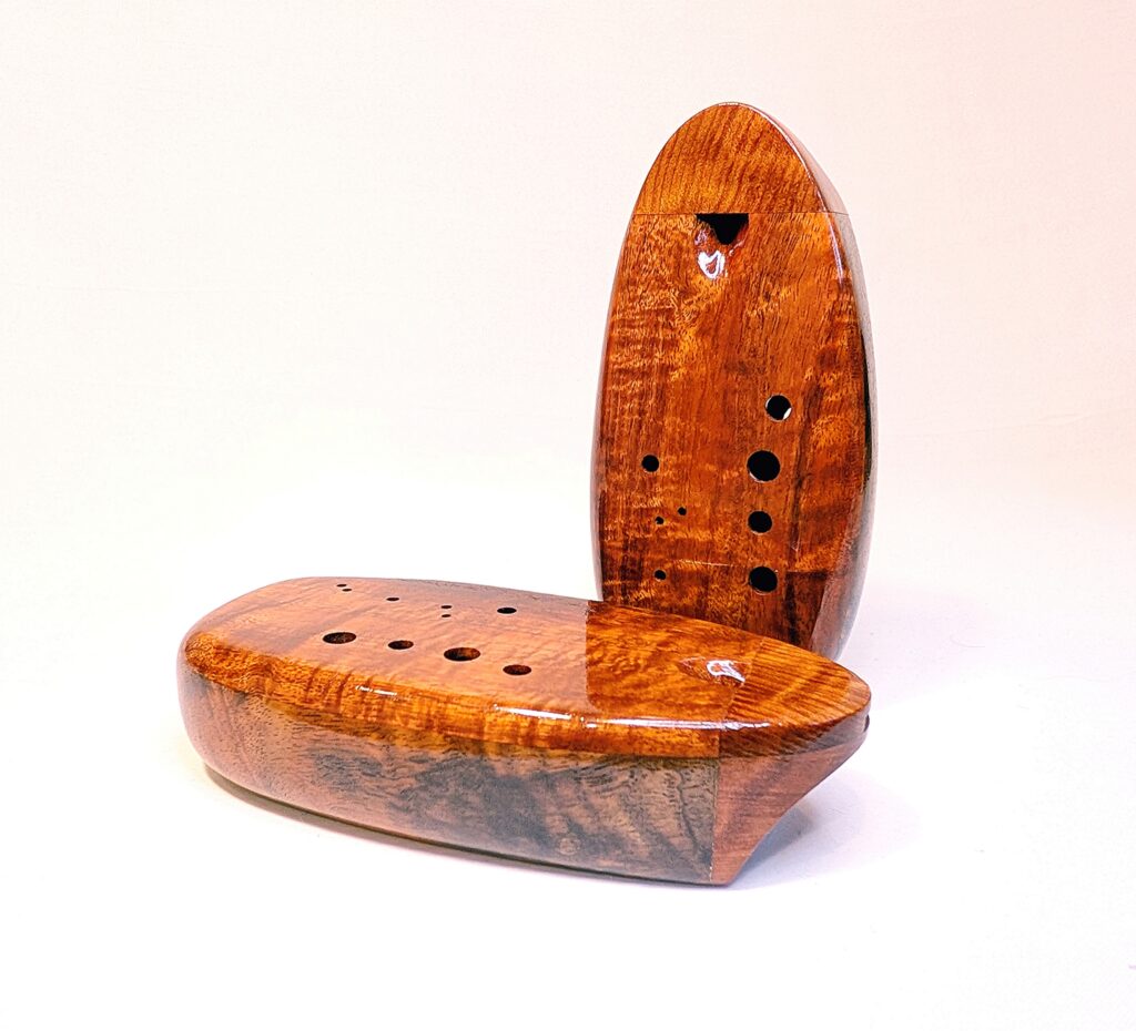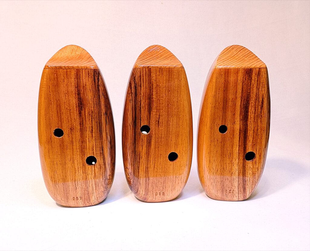 The wooden inline ocarina has become a cornerstone at Bretti Musical Instruments, redefining it as a high-end woodwind. Each ocarina is painstakingly crafted over a 3 month period, with exceptional attention to material selection, wood pairing, grain features, layout, voicing, and finish. The inline ocarina has historically been seen as a more limited instrument compared to its far more ubiquitous transverse (or “sweet potato”) ocarina cousin, and compared to transverse ocarinas, who have enjoyed significant advances over the years, the inline family of ocarinas has remained relatively stagnant. Up until this point, inline ocarinas have featured a more limited note range, with limited available materials, with makers of inline ocarinas have become increasingly rare. My goal with the inline ocarina however has been to elevate the inline to a high-end, professional quality woodwind for the discerning musician and collector, and offer an unmatched selection of extraordinary woods and a wider number of keys than prior available.