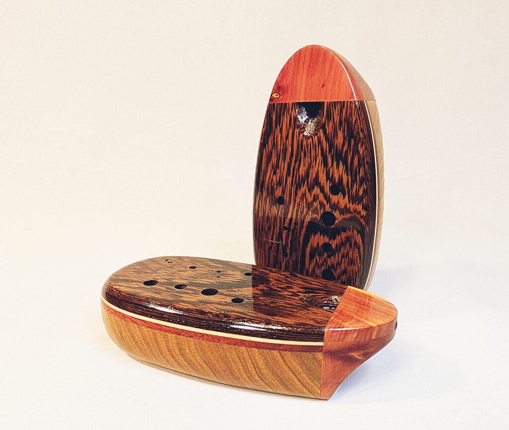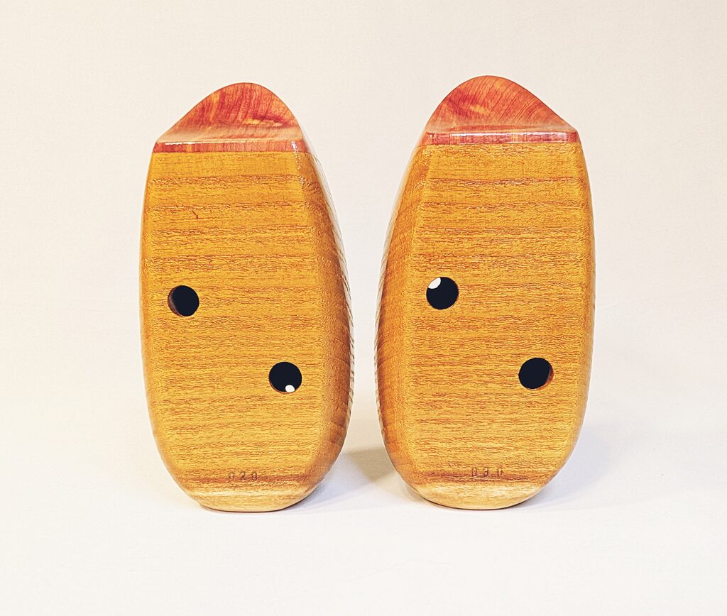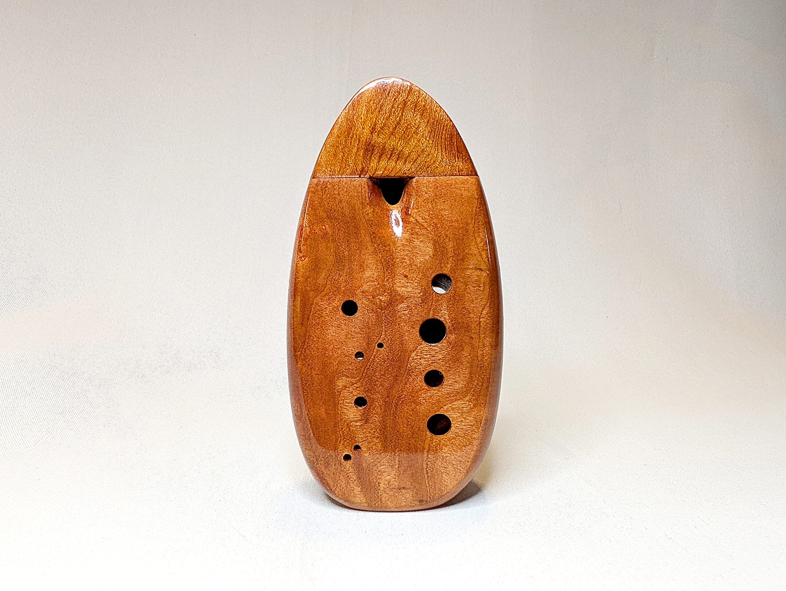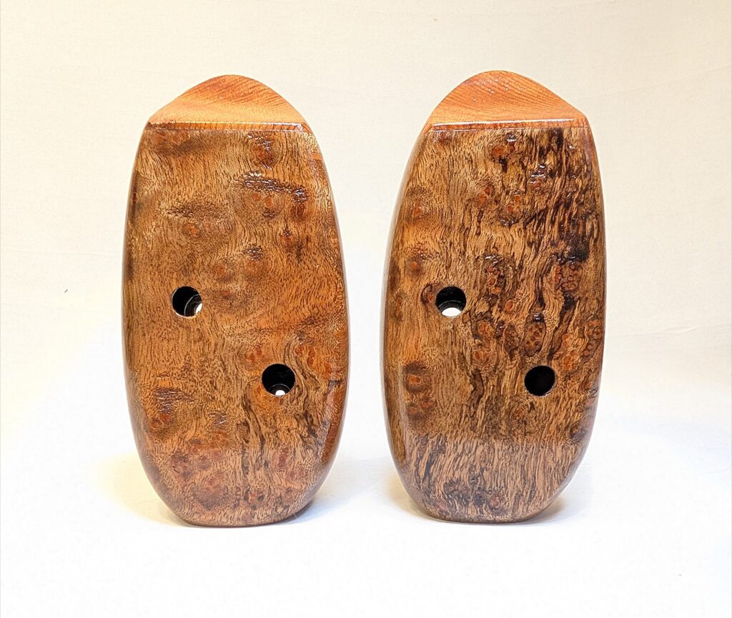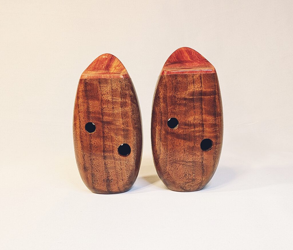 The wooden inline ocarina has become a cornerstone at Bretti Musical Instruments, redefining it as a high-end woodwind. Each ocarina is painstakingly crafted over a 3 month period, with exceptional attention to material selection, wood pairing, grain features, layout, voicing, and finish. The inline ocarina has historically been seen as a more limited instrument compared to its far more ubiquitous transverse (or “sweet potato”) ocarina cousin, and compared to transverse ocarinas, who have enjoyed significant advances over the years, the inline family of ocarinas has remained relatively stagnant. Up until this point, inline ocarinas have featured a more limited note range, with limited available materials, with makers of inline ocarinas have become increasingly rare. My goal with the inline ocarina however has been to elevate the inline to a high-end, professional quality woodwind for the discerning musician and collector, and offer an unmatched selection of extraordinary woods and a wider number of keys than prior available.