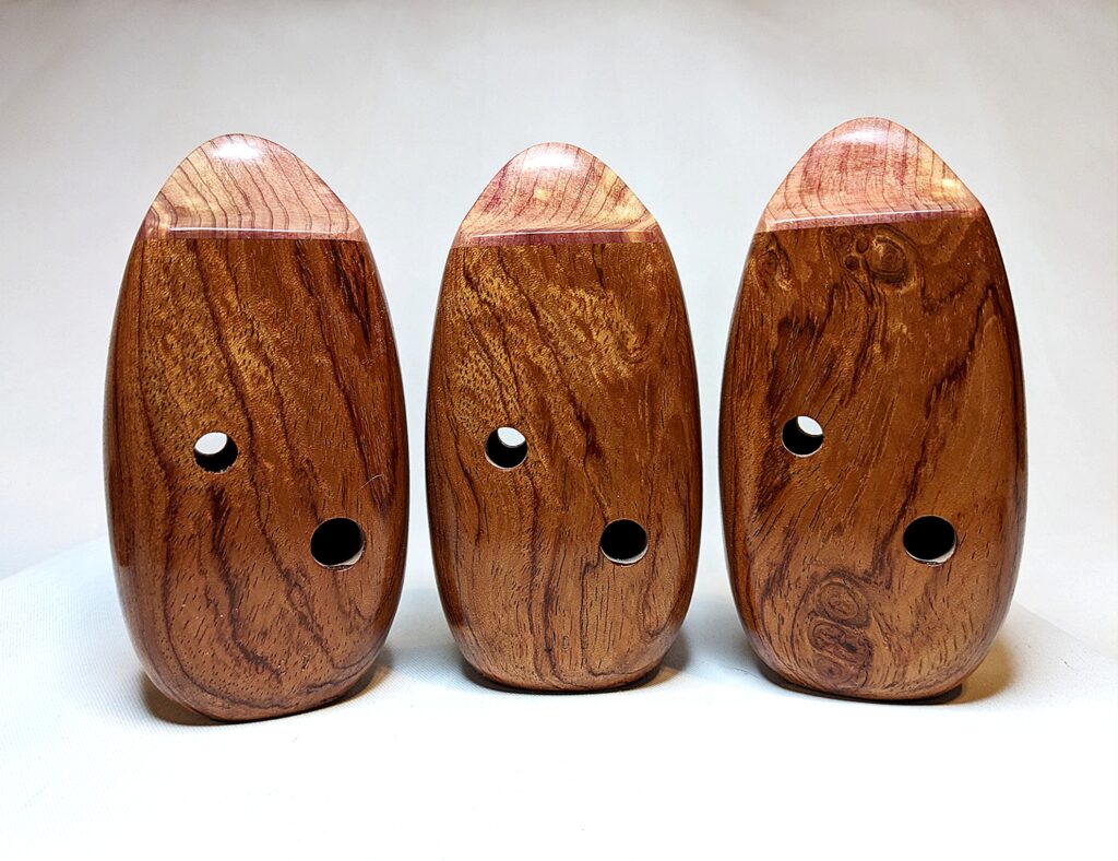Because of the incredibly challenging and precise voicing required for an inline ocarina to work over an extended 19-note range, a key feature of these ocarinas has become the use of a distinct mouthpiece, which utilizes either solid aromatic cedar, or curly redwood. Both of these woods are some of the most moisture absorbent and moisture stable woods in the world (with aromatic cedar being the wood of choice for fine wooden recorder blocks for hundreds of years), and combined with the physical properties of these woods in addition to extremely careful selection of high quality pieces for proper grain orientation and grain quality, moisture control is optimized in the windway, leading to a wooden ocarina that is virtually clog-free under normal use, even under long practice sessions. In this way, you can enjoy the unique and various flavors of any woods, both hard and soft, for the body, without worry of clogging. This mouthpiece style has become a defining aspect of my inlines, and these ocarinas would not in fact even work across the full range without a highly-absorbent mouthpiece.