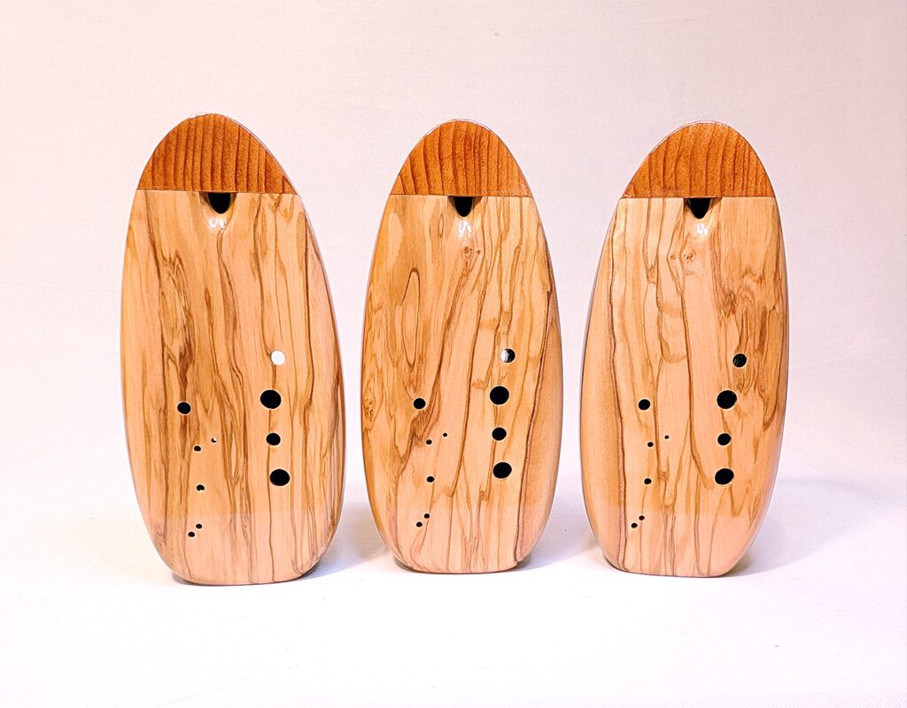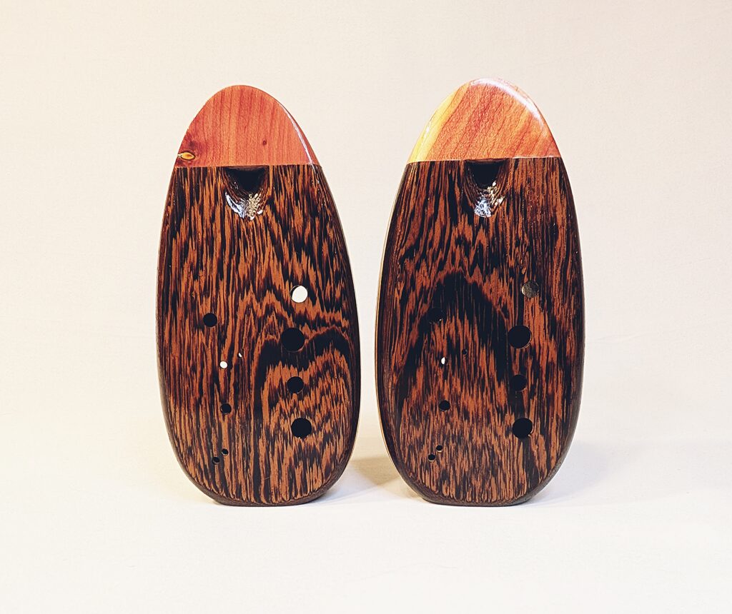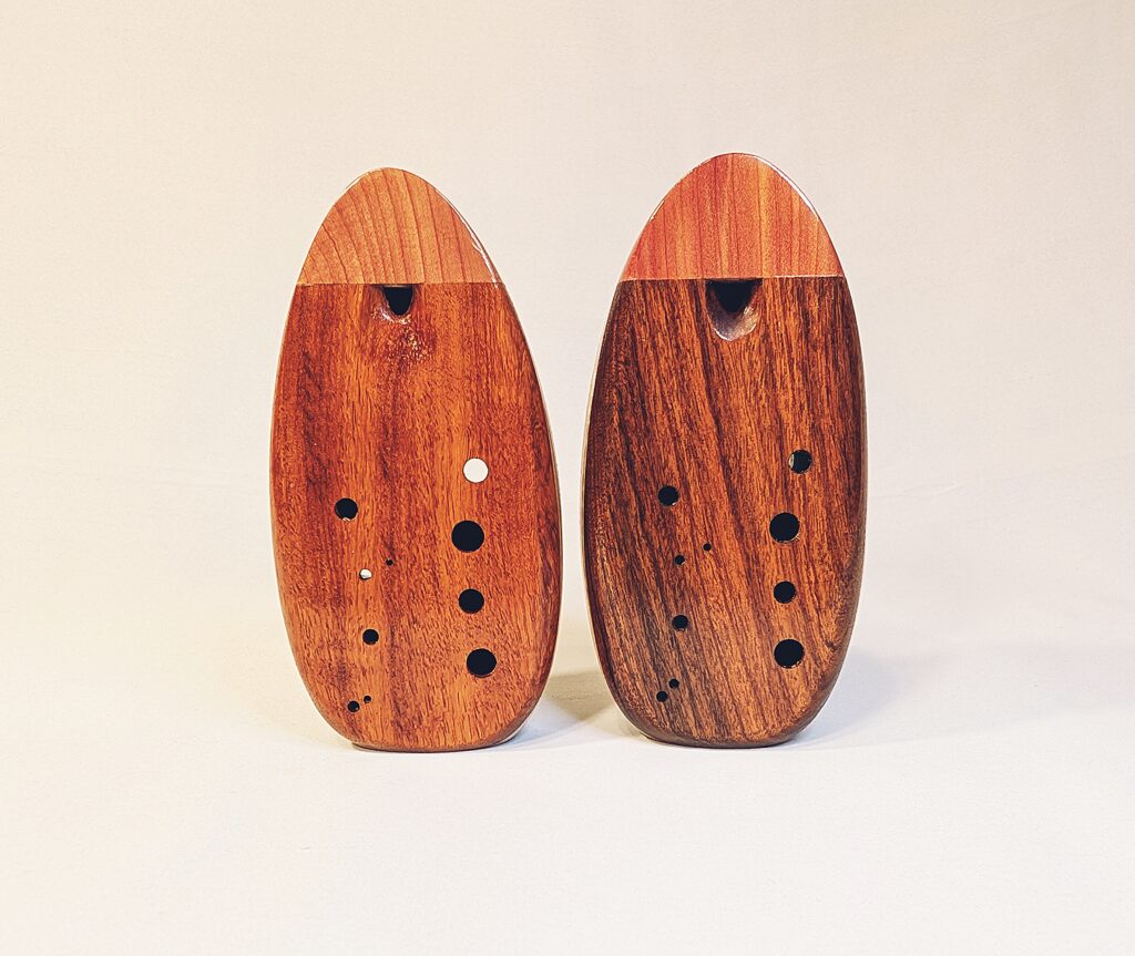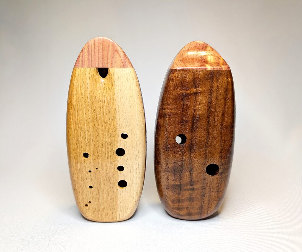 Finally, each ocarina undergoes a long and laborious finishing process, which balances food safety and durability. All parts of the ocarina that directly interact with the player’s mouth and breath (the inside of the ocarina cavity as well as the outside of the cedar/redwood mouthpiece) are finished in numerous, hand-brushed layers of the highest quality shellac made from pure shellac flakes and 100% food grade ethanol. The outside of the body is finished in a number of hand-rubbed layers of a penetrating, hardening oil varnish, which not only brings out the extra beauty and richness in the colors of the woods, but also provides an extra level of protection. Both the mouthpiece and body are finished to a high-gloss for a showpiece-quality instrument as beautiful to look at and display as they are to play. Each ocarina is signed, dated, and serialized inside, and stamped with a unique serial number on the outside.