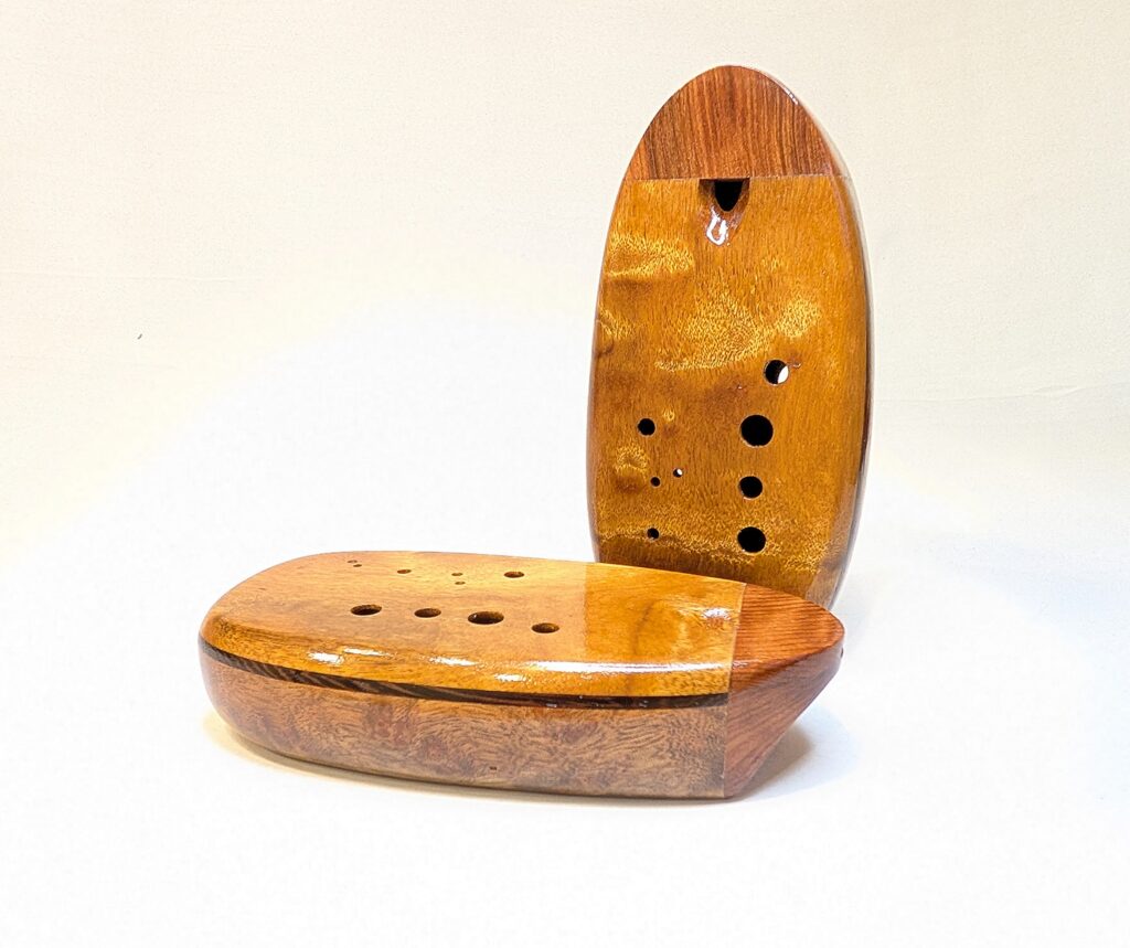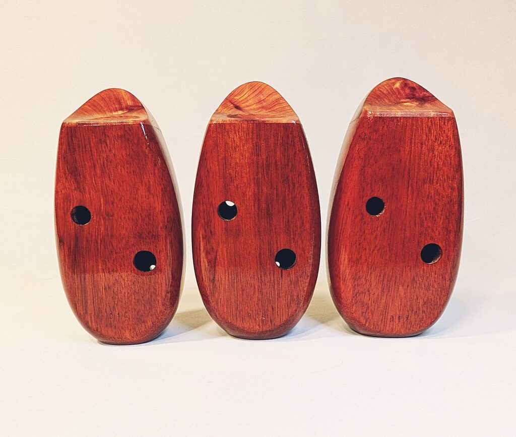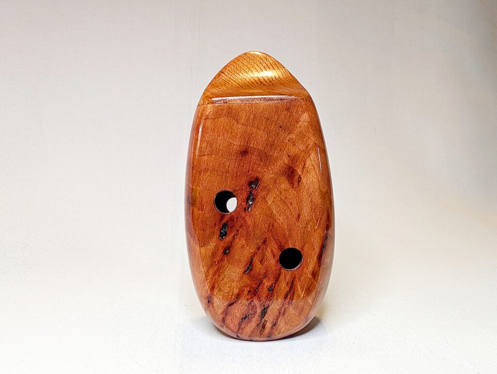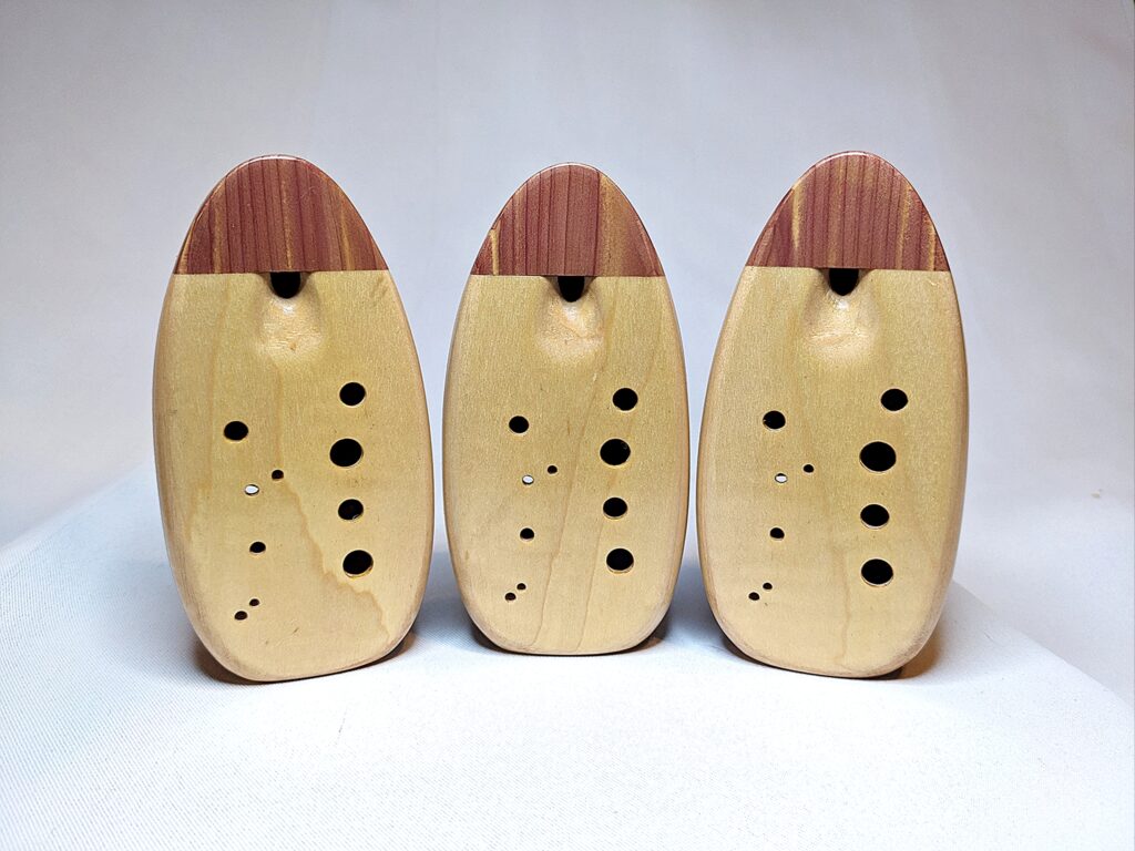 Finally, each ocarina undergoes a long and laborious finishing process, which balances food safety and durability. All parts of the ocarina that directly interact with the player’s mouth and breath (the inside of the ocarina cavity as well as the outside of the cedar/redwood mouthpiece) are finished in numerous, hand-brushed layers of the highest quality shellac made from pure shellac flakes and 100% food grade ethanol. The outside of the body is finished in a number of hand-rubbed layers of a penetrating, hardening oil varnish, which not only brings out the extra beauty and richness in the colors of the woods, but also provides an extra level of protection. Both the mouthpiece and body are finished to a high-gloss for a showpiece-quality instrument as beautiful to look at and display as they are to play. Each ocarina is signed, dated, and serialized inside, and stamped with a unique serial number on the outside.