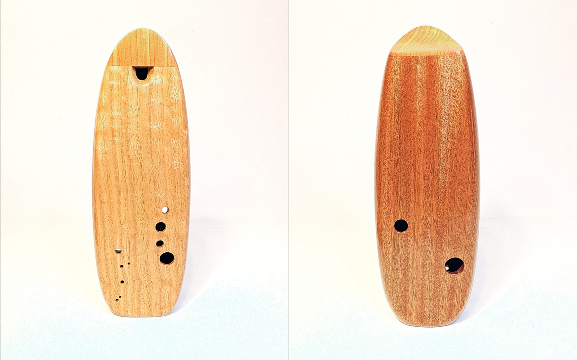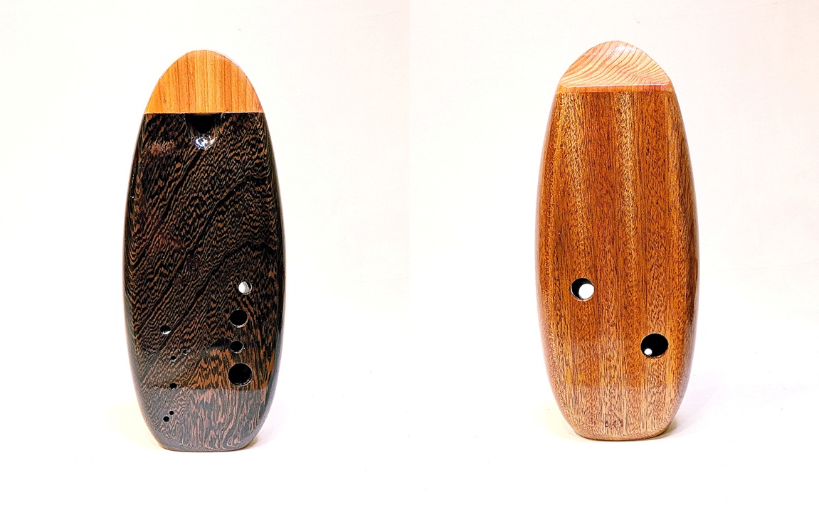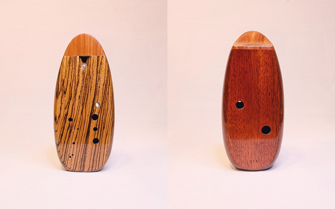 Begin the journey for your ultimate dream wooden inline ocarina. I pride myself in meticulous selection of fine woods from all over the world, and as long as I can source the wood and am not allergic to it (currently not working with cocobolo, camatillo, and Bolivian rosewood), I will make your ocarina in any key from bass B3 to alto A4 out of any combination of woods in the world – the sky is literally the limit! I work extremely closely with my clients every step of the way, and because the custom ocarina process is highly involved, and I want my clients to play a major part in the design of their instrument, and help make their vision a reality. Starting price for custom inline builds is $400, and throughout the process you get regular and personal build updates, design consultation, and final detailed pictures with a specialty batch unveiling video for each set. Please note that due to my current backlog of requests and regular production, wait times are around 6 months average for a custom inline build.