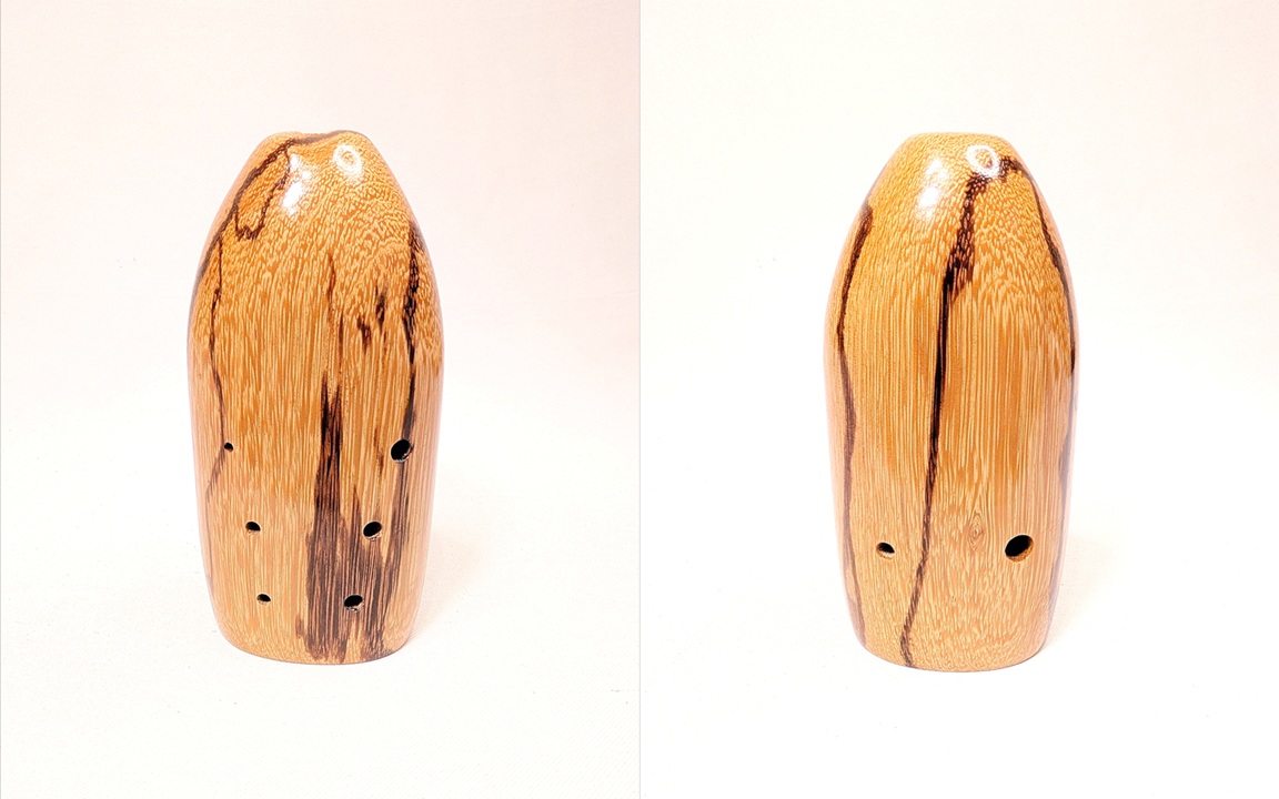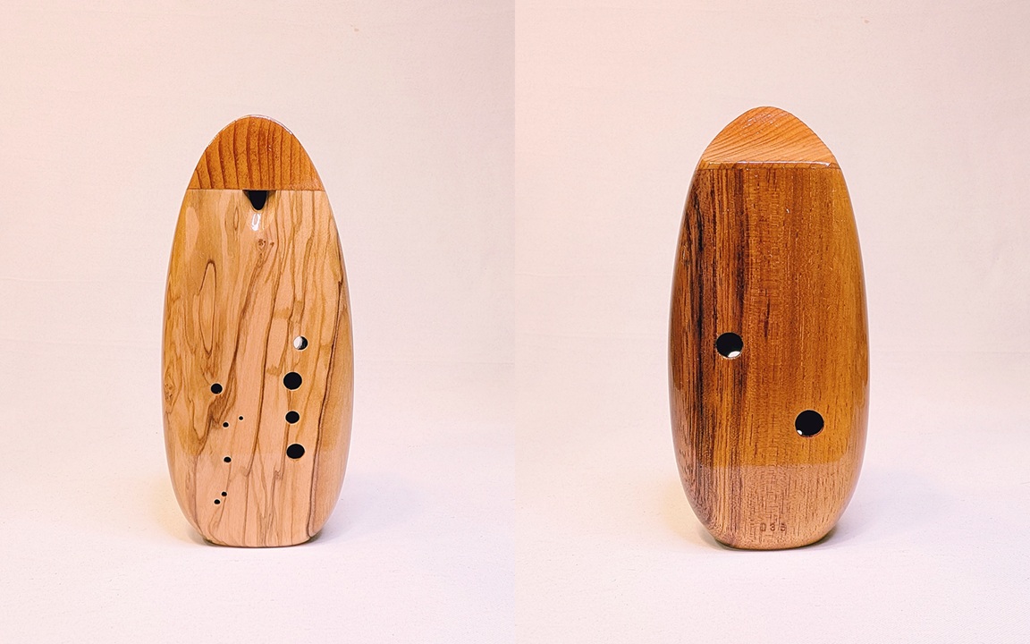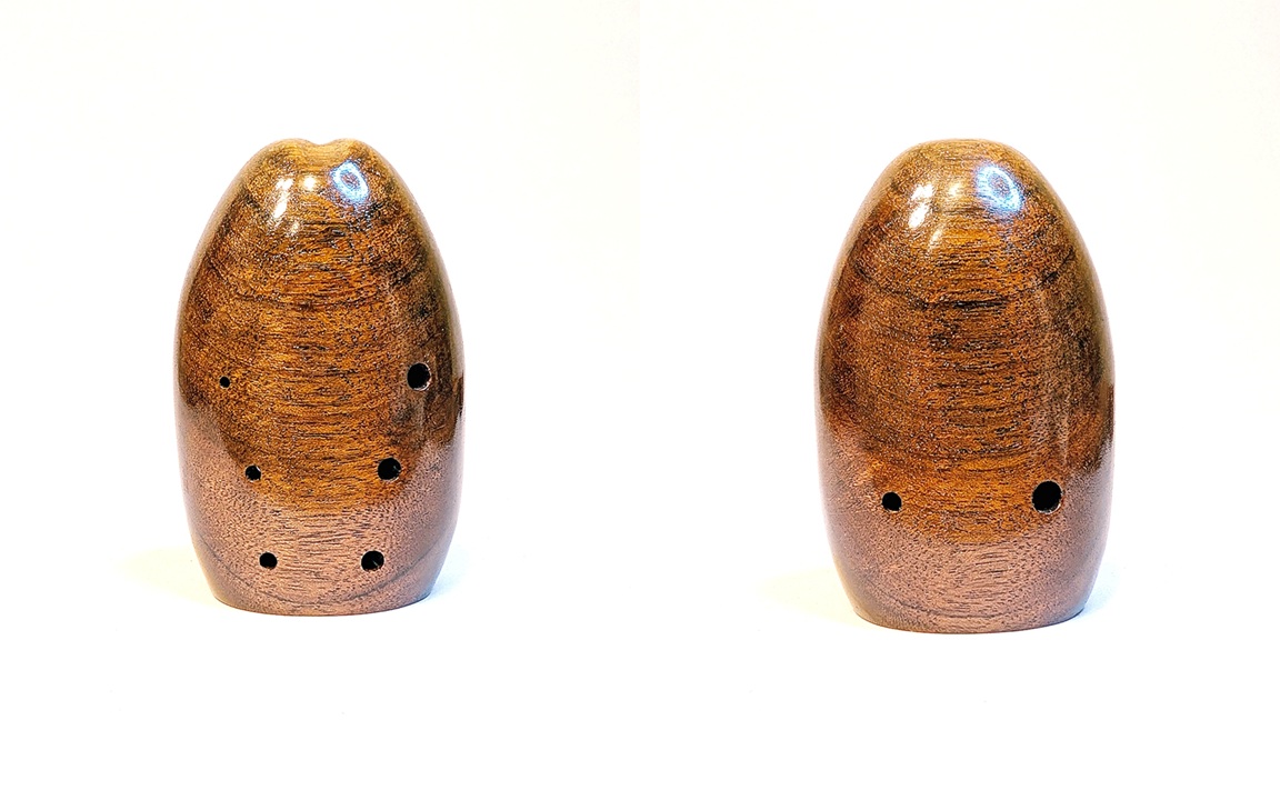 DESCRIPTION: An exquisite alto A4 made from a unique combination of woods that uses the natural rawness of the inclusions found in the burl to highlight the natural beauty of the wood. The tone of this ocarina is absolutely stunning, equally matching the beauty of the woods. The response is just utterly smooth and effortless with incredible responsiveness. The timbre is amazingly warm, especially for a higher pitched alto A4, and is the warmest alto A4 I have ever made. The ocarina has a lower backpressure than typical altos that I make and is such an easy ocarina to play. The breath curve is gently rising, with beautifully warm lows, mellow mids, and a fluttery sweet high end that just sings. This is truly a professional grade performance wooden alto A4 that you will be able to grow into and enjoy over the years.